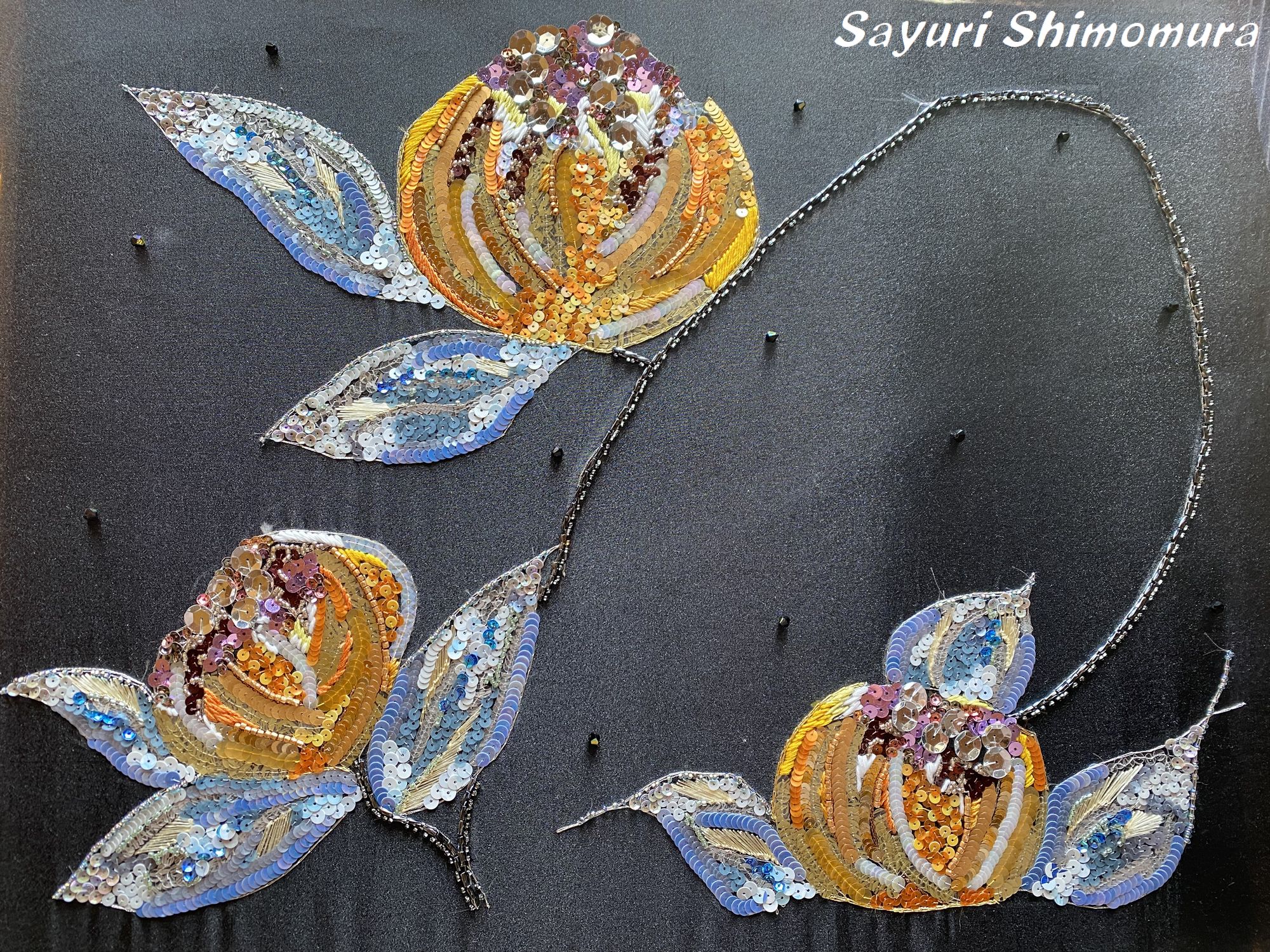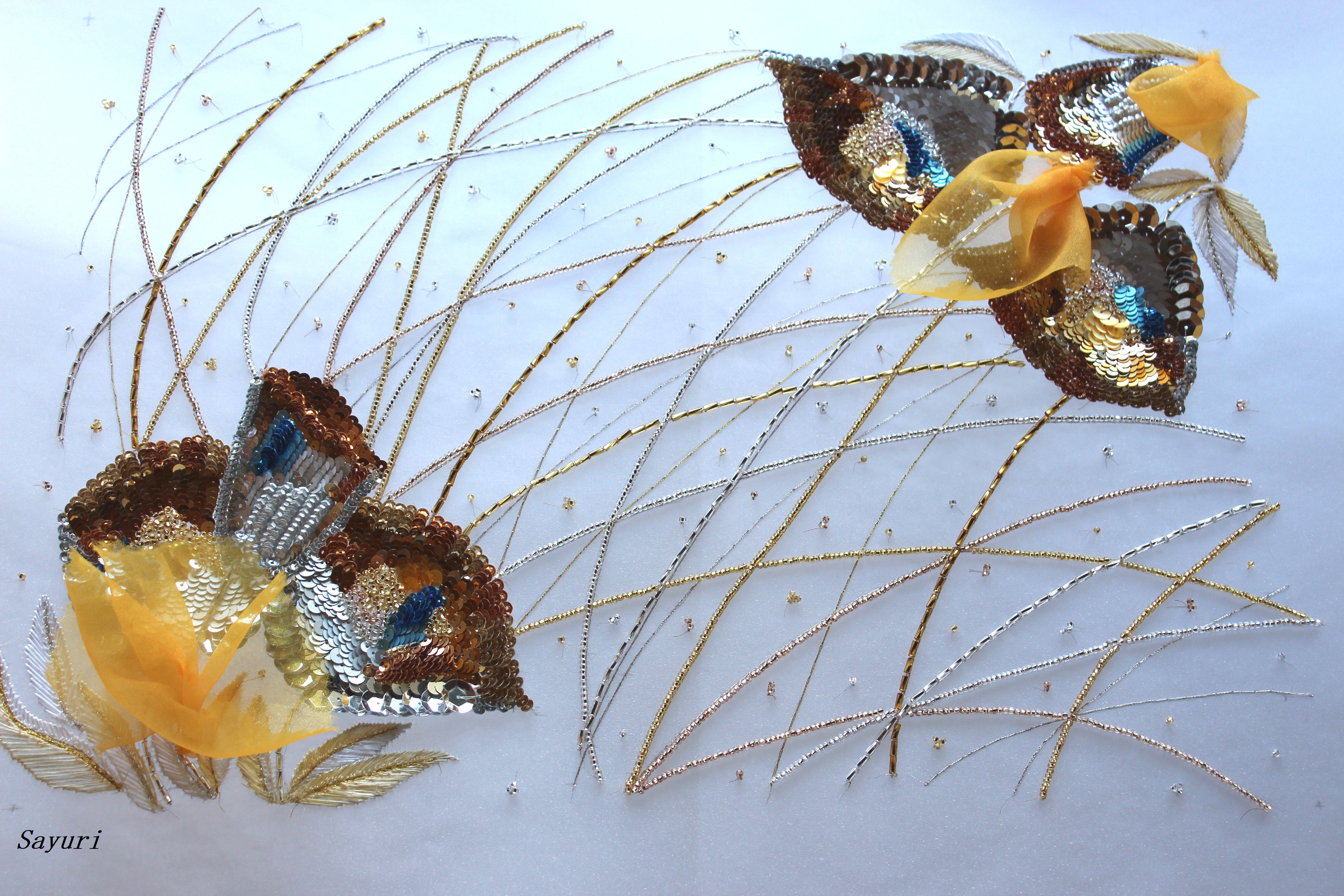 フランスの金銀細工の人間国宝ロラン・ダラスプのチューリップグラスをモチーフに作成しました。久しぶりに原点回帰?ゴールドとシルバーの素材はリュネビル刺繍の王道ですが、同一作品に使用するにはバランスを考える必要がありました。