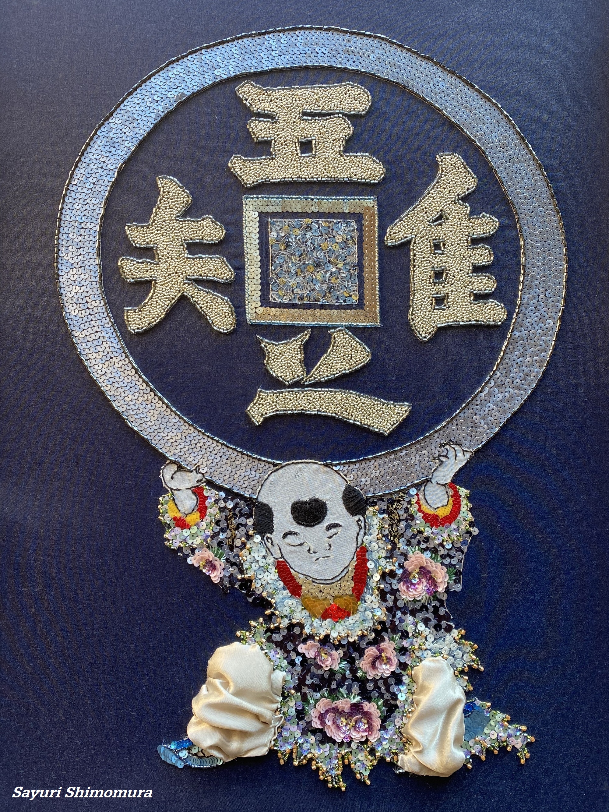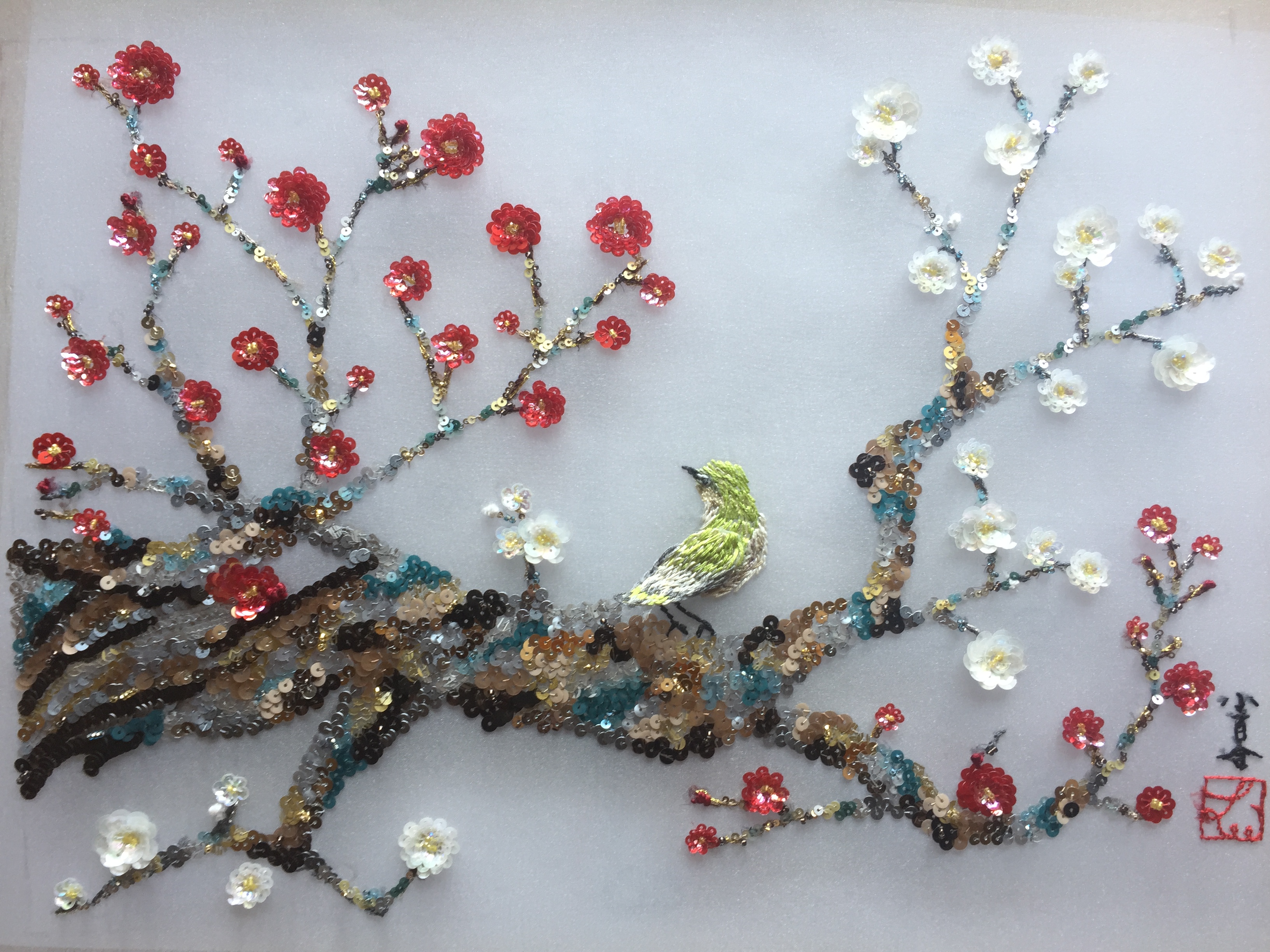 よくある”梅にウグイス”のモチーフを選んだのは、日本画のたらし込みの技法をリュネビル刺繍で表現できないかと思ったからです。紙を湿らせ絵の具をにじませて木の幹の質感を出すことを、スパンコールのグラデーションで行うのは一つの挑戦でした。そのためどの材料を使うか考える時間がとても長かったのが印象に残っています。