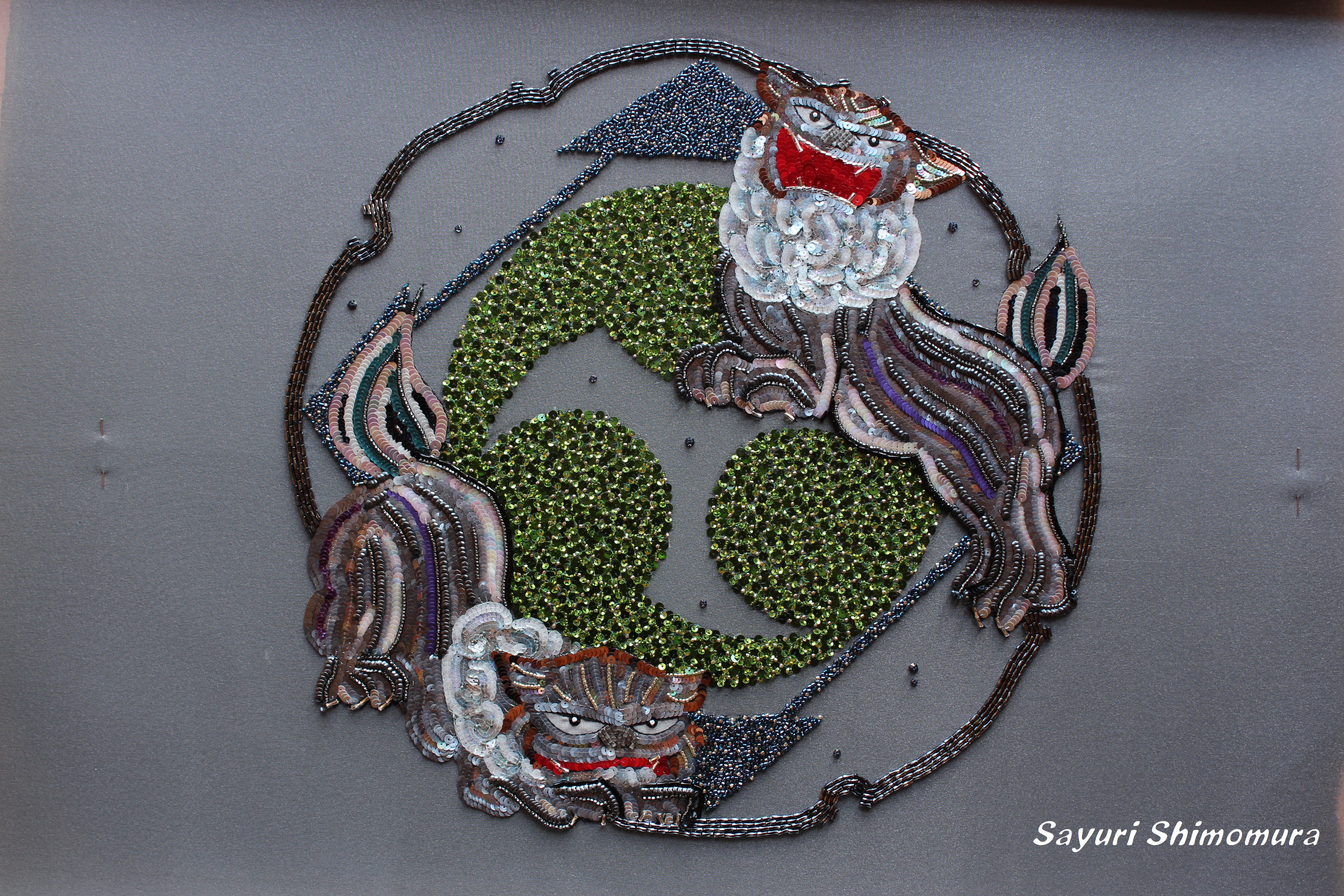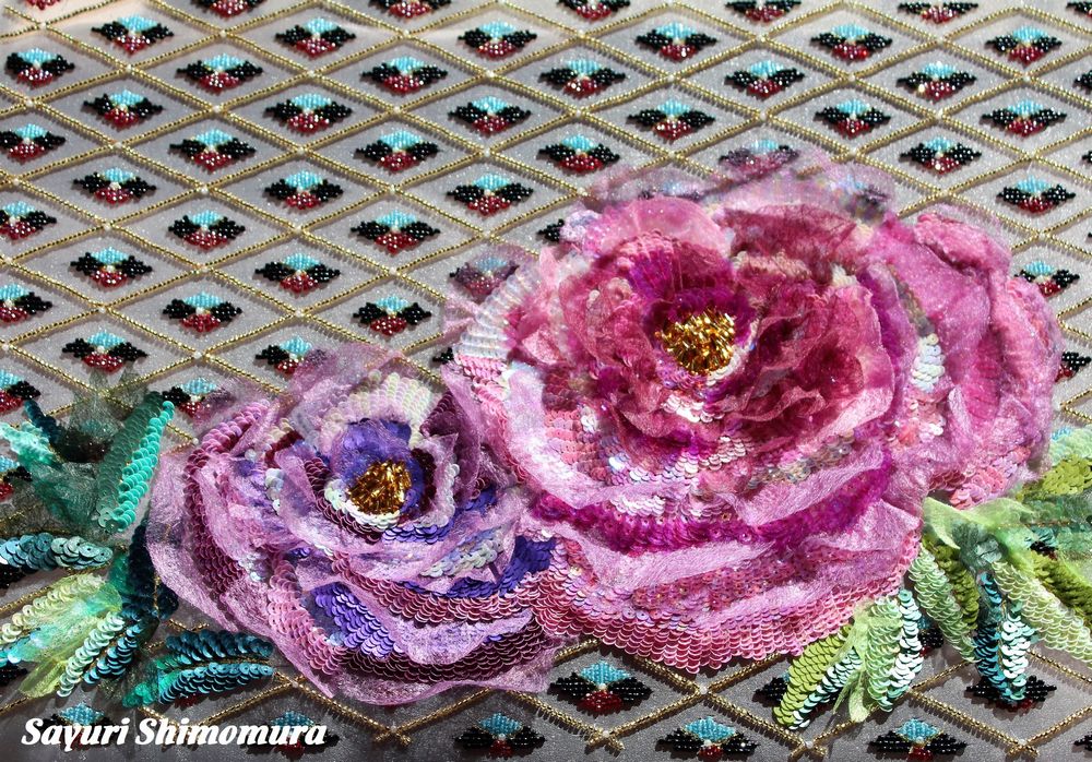 春先から始めたのですが夏場に「パリの刺繍学校」の出版のため中断、秋から冬にかけてやっと完成しました。牡丹の花びらには果物のパッケージに敷いてある吸水シートを使いました。背景の菱形は和風テイストをねらったものの色使いに悩み、終わってみれば水色と深紅を両サイドの黒が引き締めてくれたかと思います。列ごとの数を決めて留めると、ビーズの素材自体にばらつきがあるためいびつになってしまいます。数にこだわらずスペースを埋めるつもりで刺すと自然と菱形が出来ました。