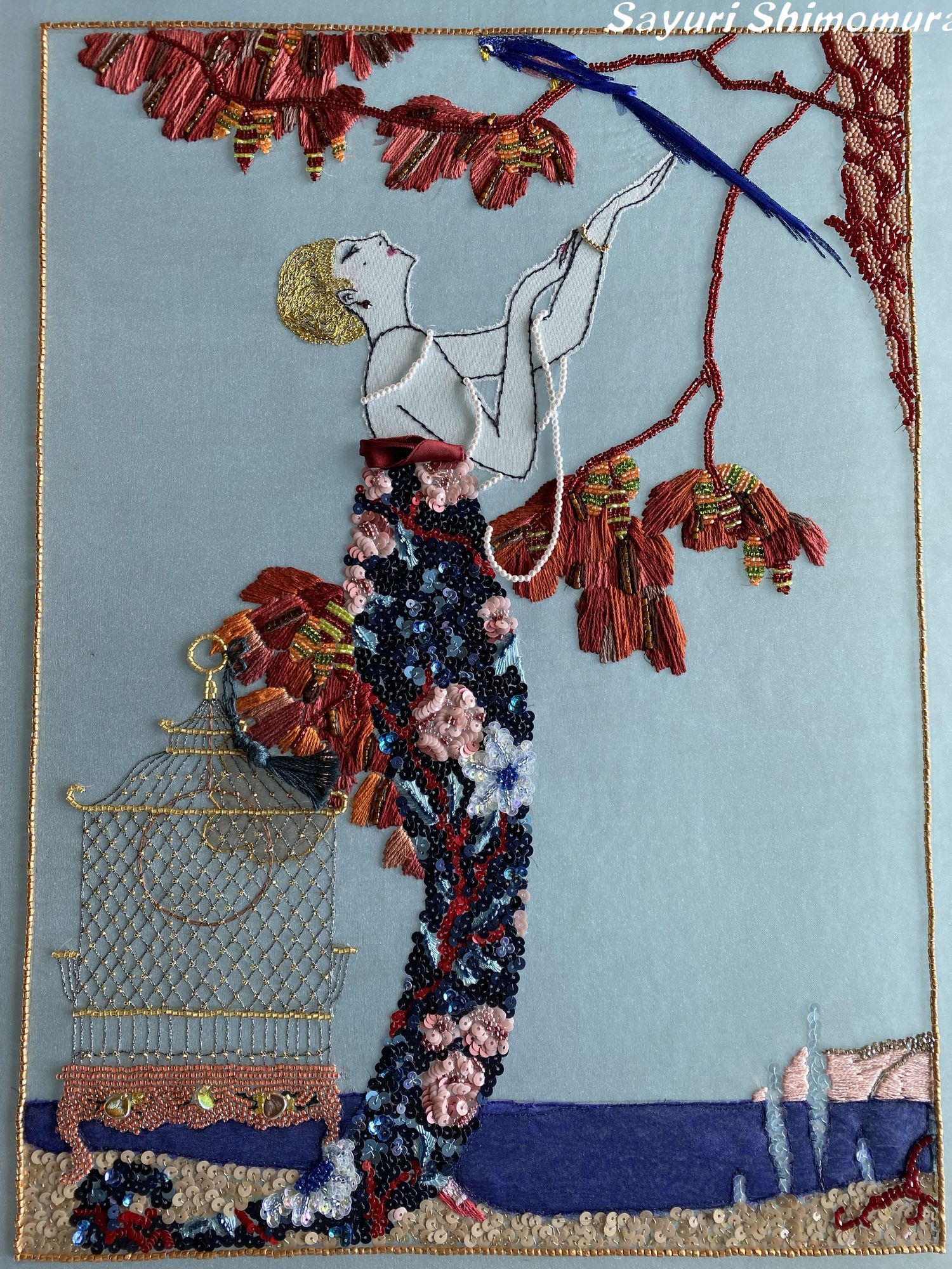 20世紀初頭パリのアールデコのイラストレーター、ジョルジュ・バルビエのファッション・プレートを元に制作しました。図案は「移り気な鳥 (L'Oiseau volage)」(1914)人物絵は前作の北斎漫画で経験済みですが、衣装とアクセサリーは女性の肌と刺繍を生かすため最小限の装飾にしました。