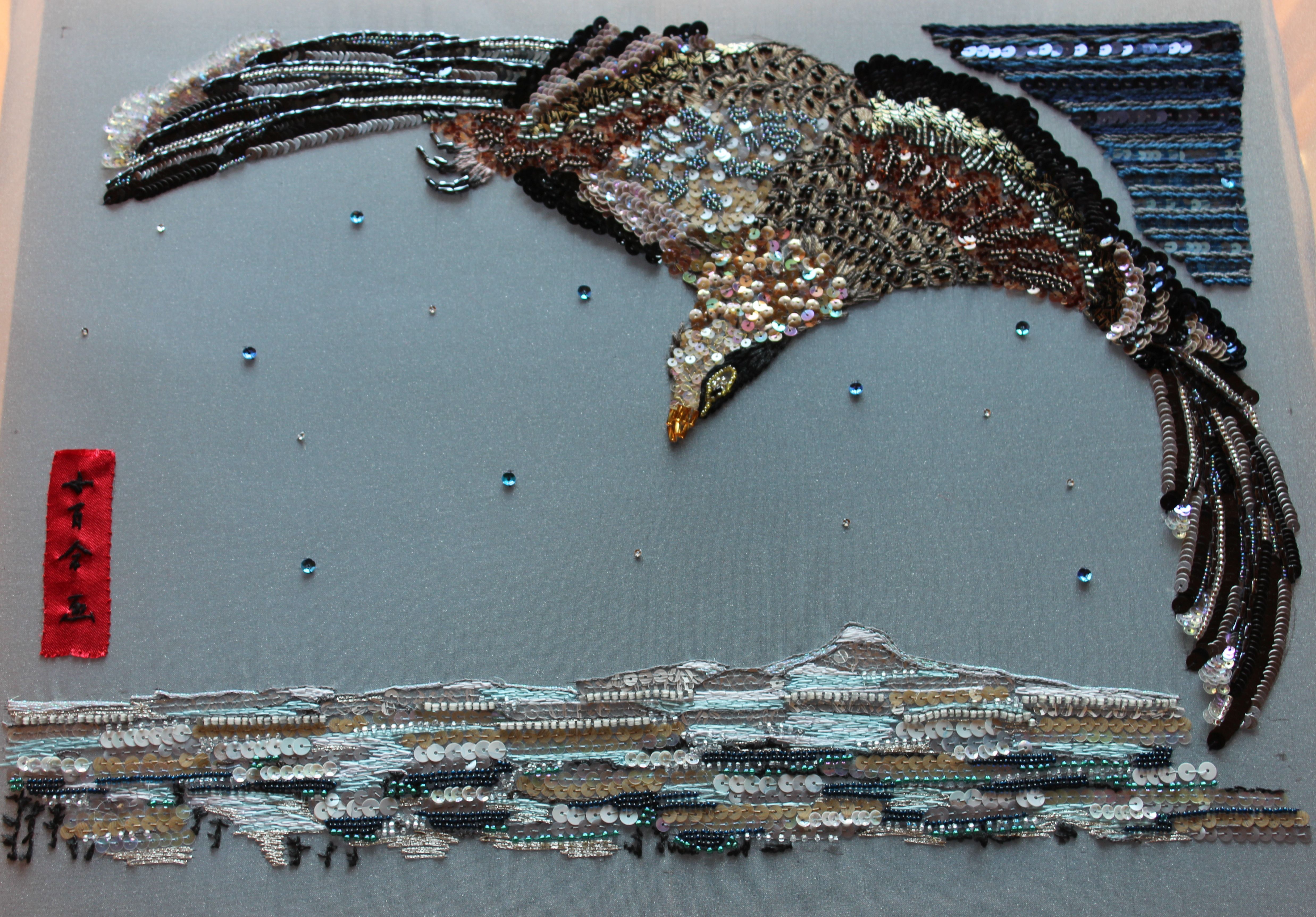 歌川広重の浮世絵をモチーフに作成しました。今回も和風テイストで色合わせには気を遣いましたがそこが楽しみでもあります。鳥の羽や爪には効果的な素材を用い右上の夜空はジャパン・ブルーのグラデーションを意識してみました。