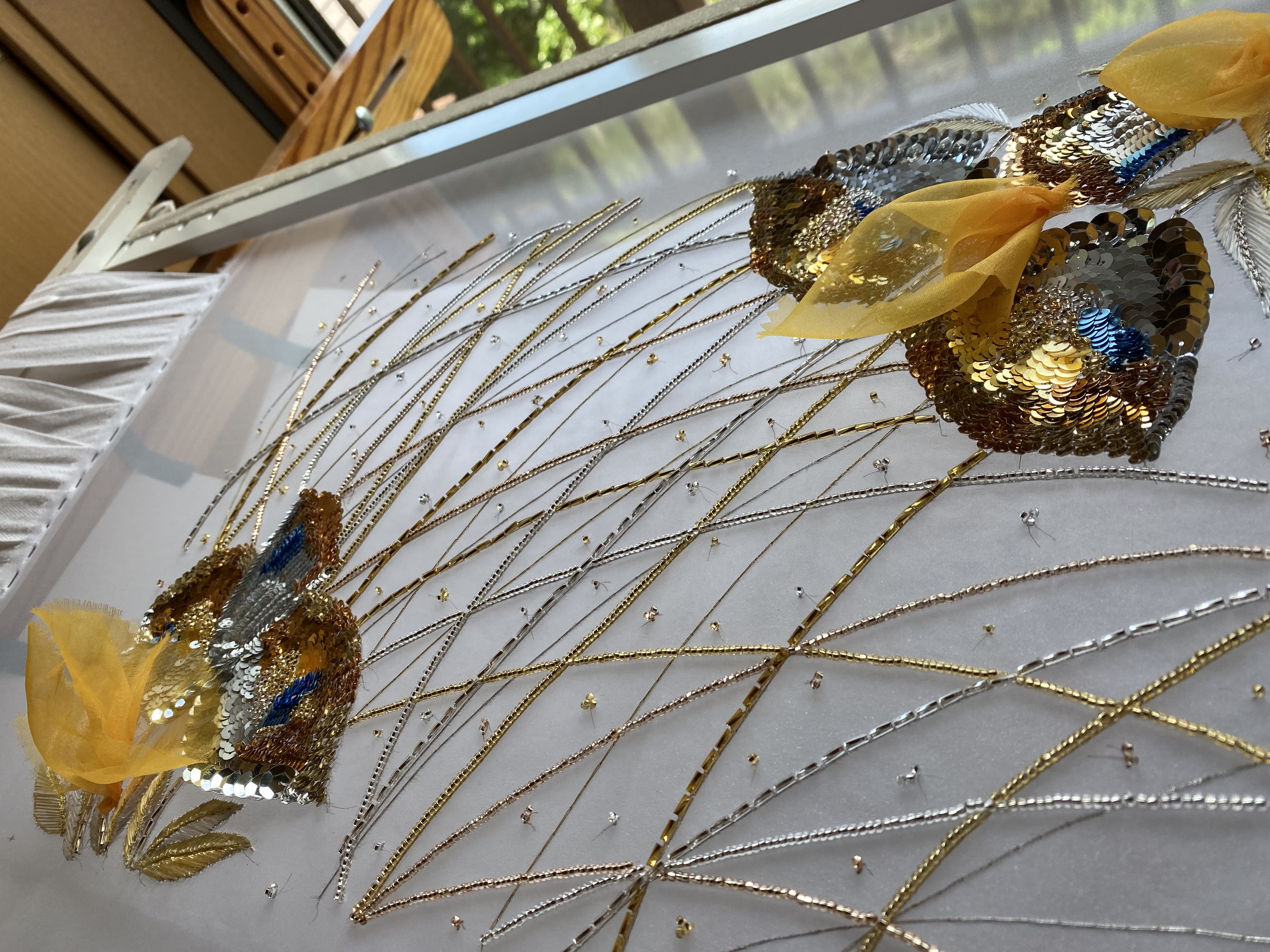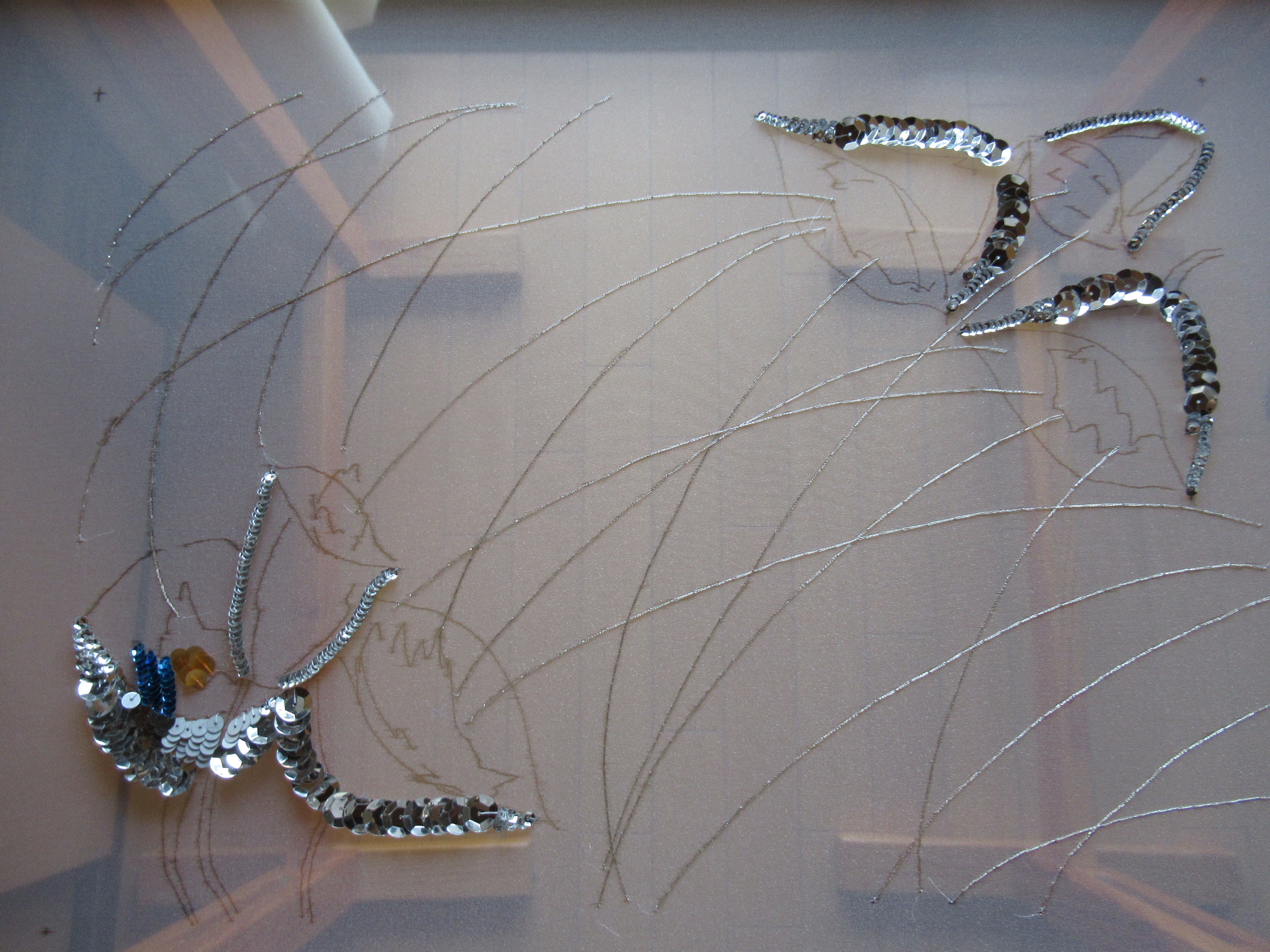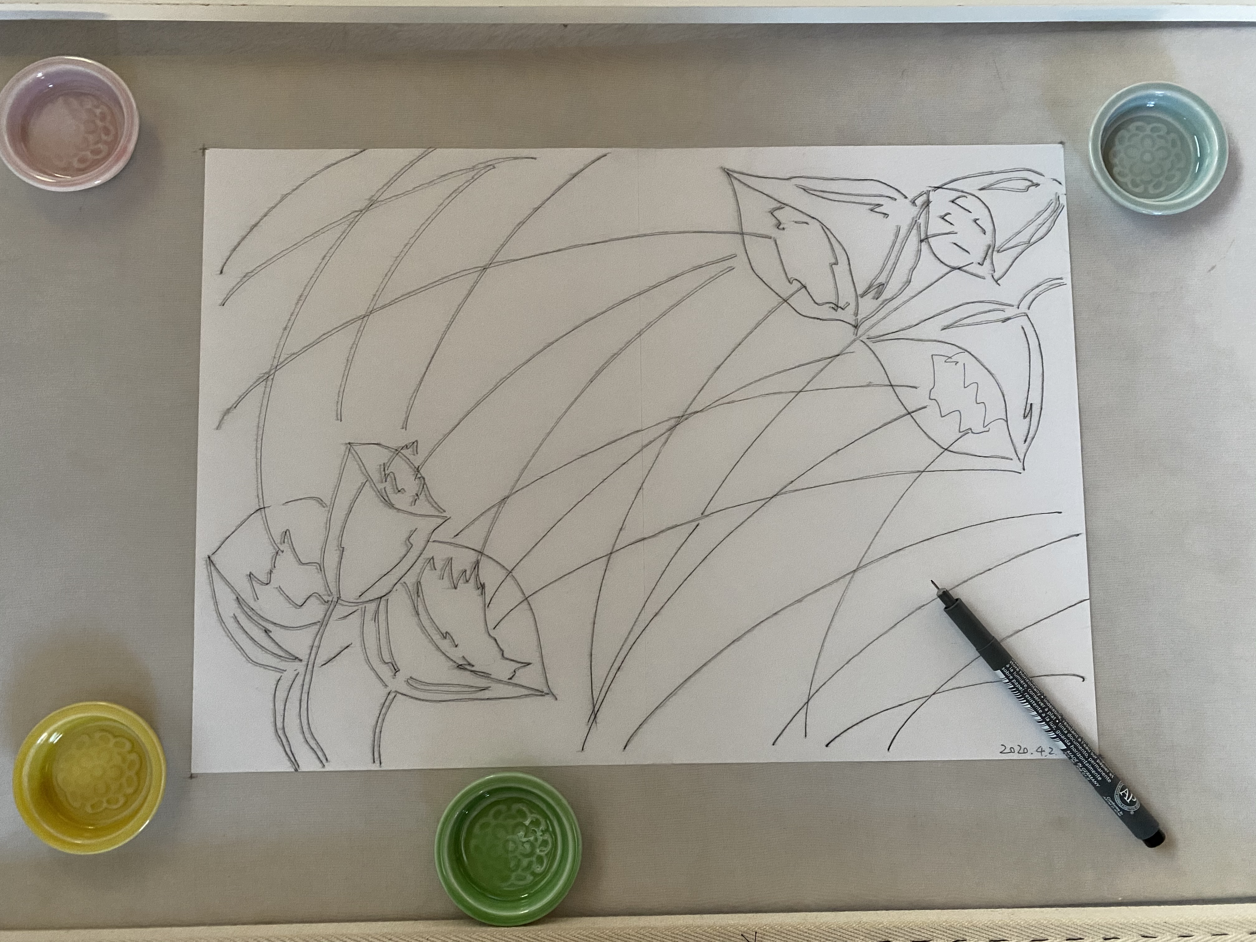刺繍枠に張ったオーガンディ布に写して作業開始(文鎮にカラフルな手塩皿を使用)