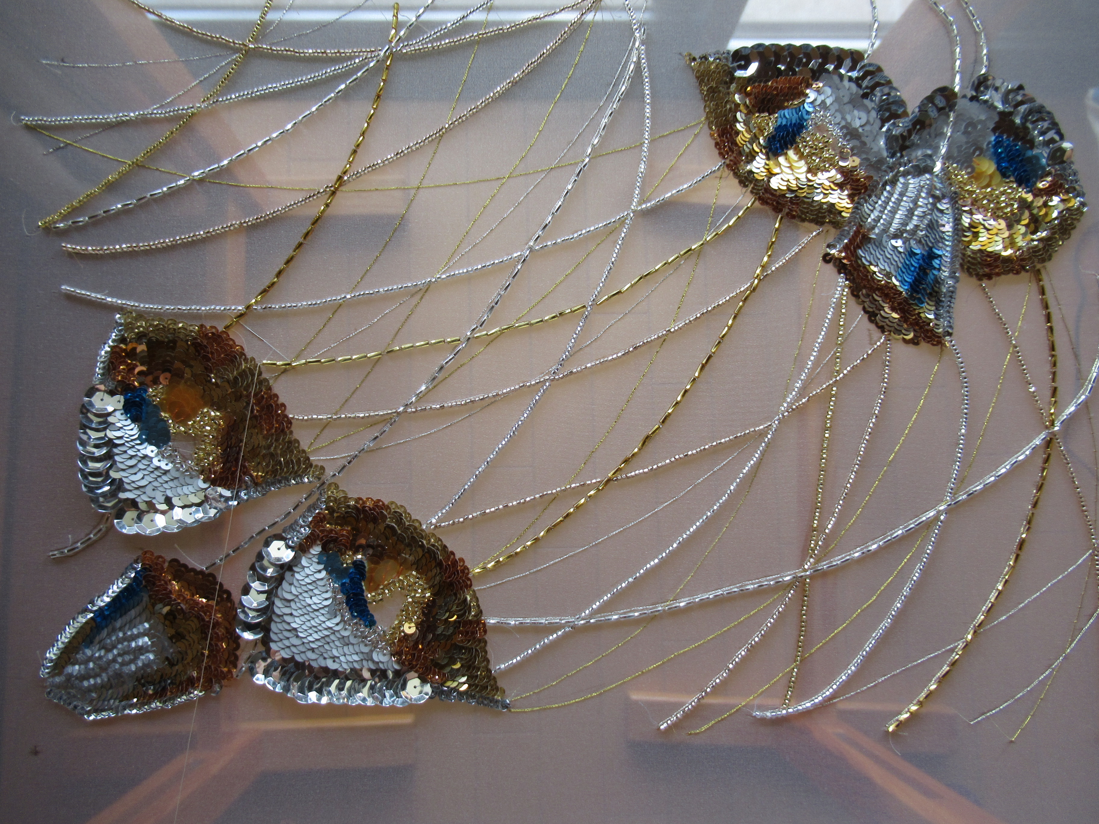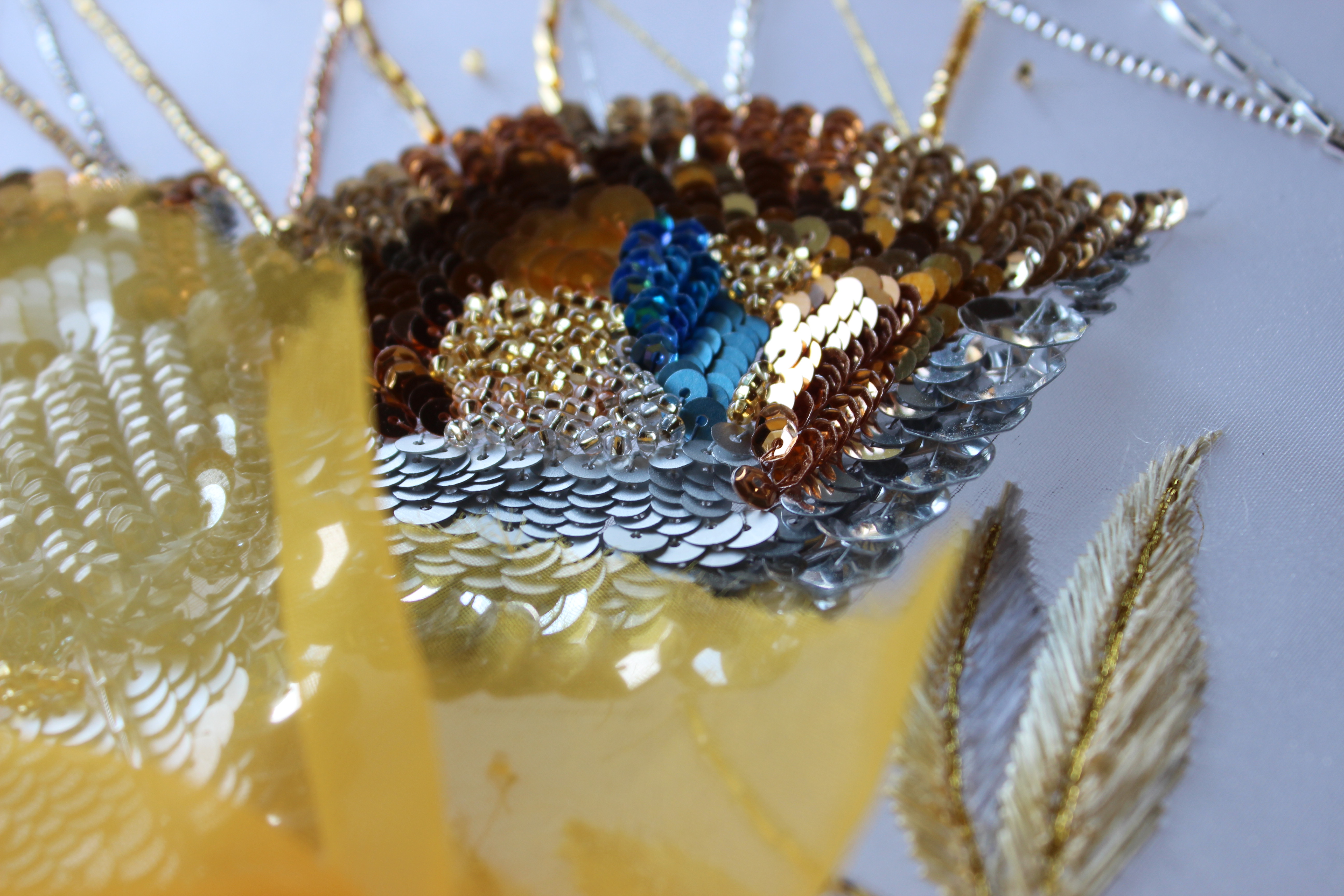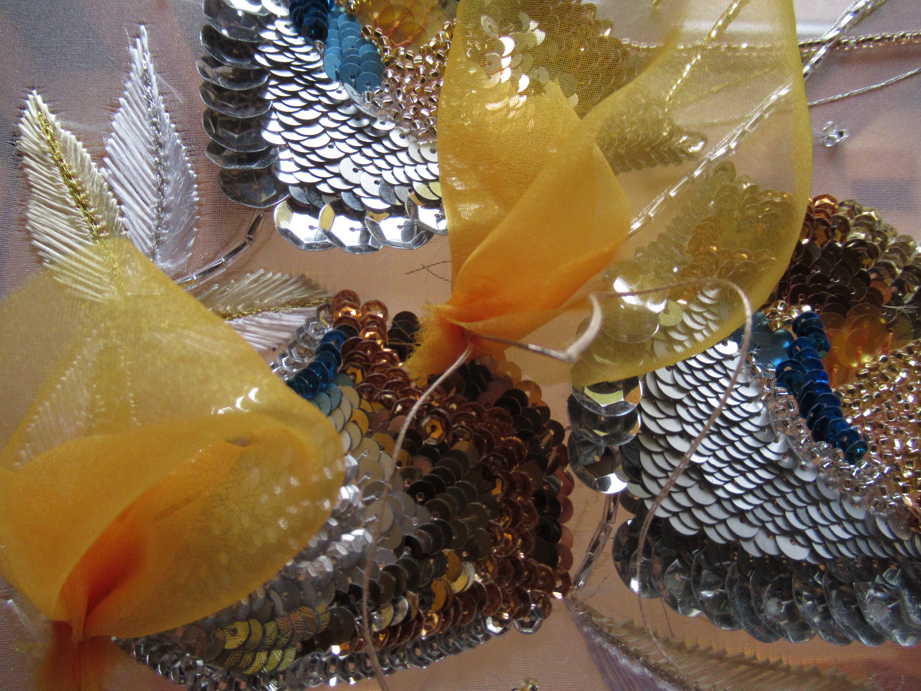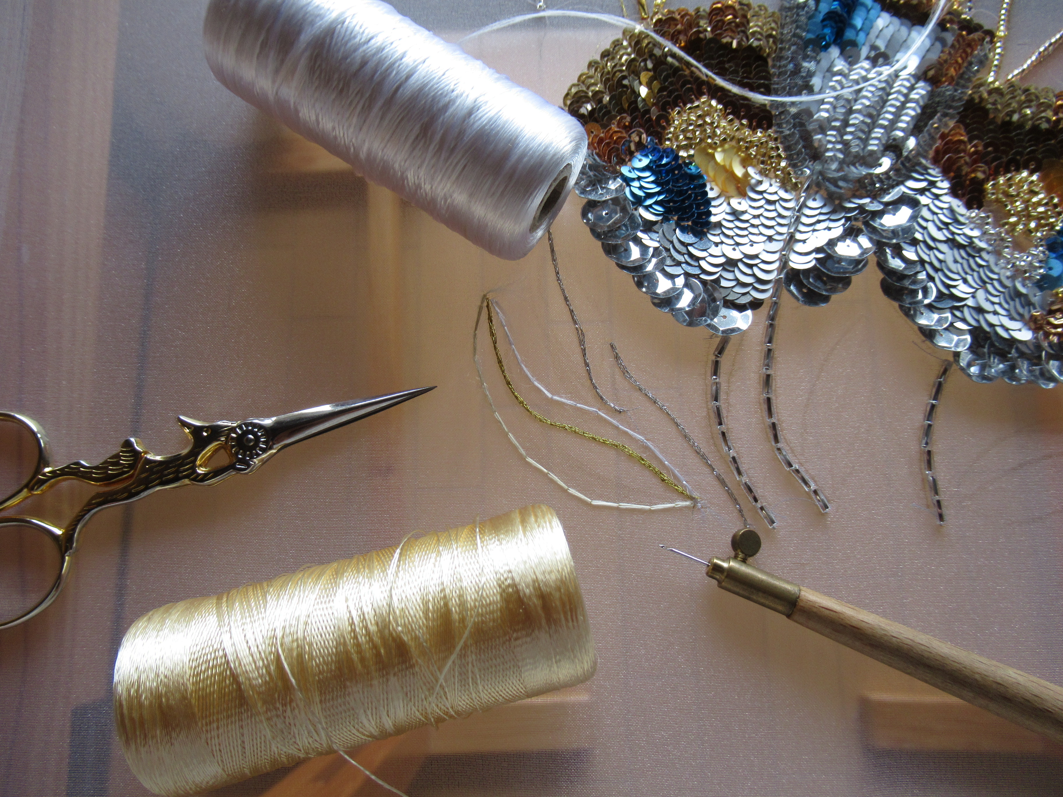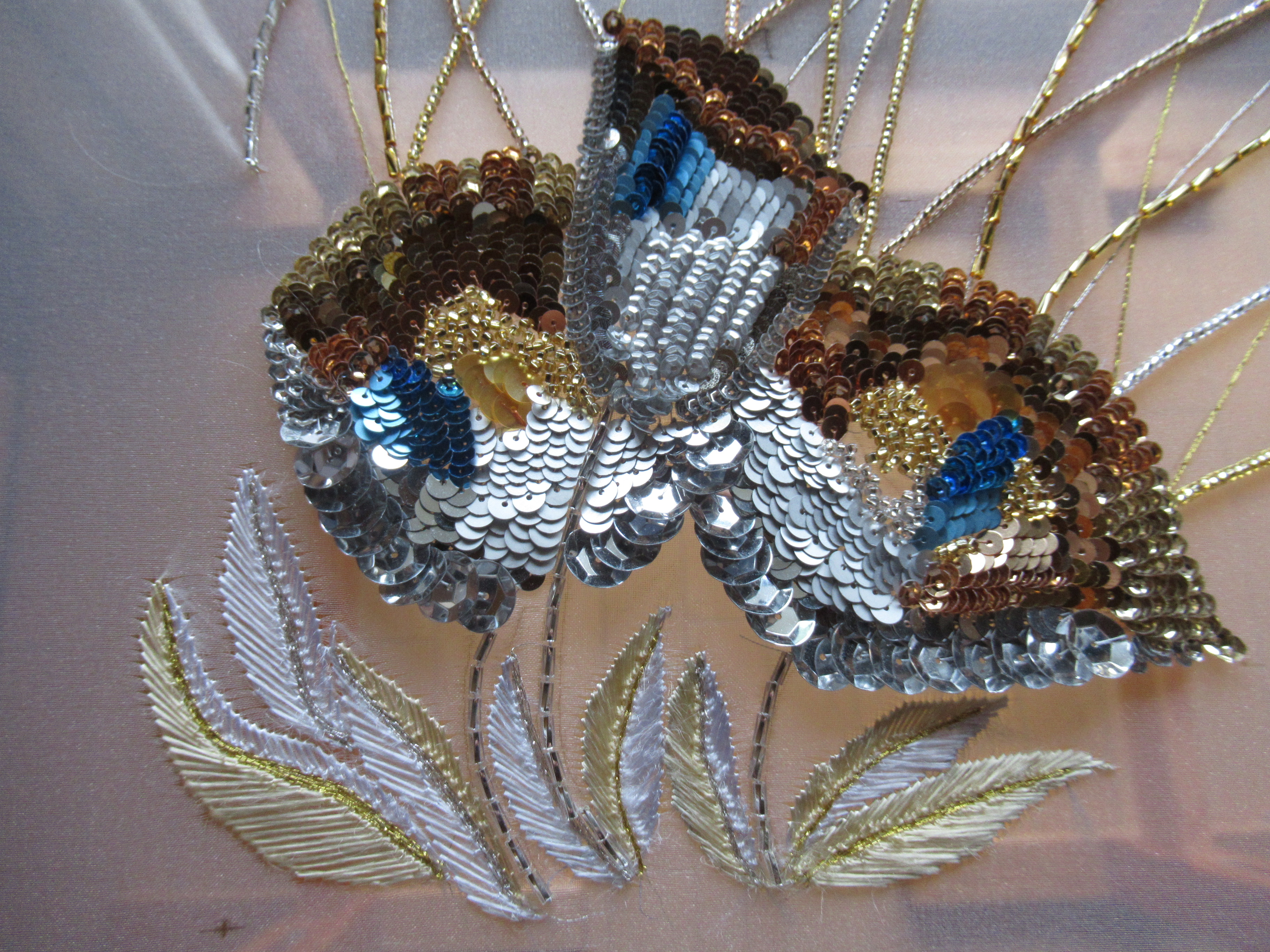 直径10ミリの大きいスパンコールはチェーンステッチ二目(ふため)で一つをとめていきます。