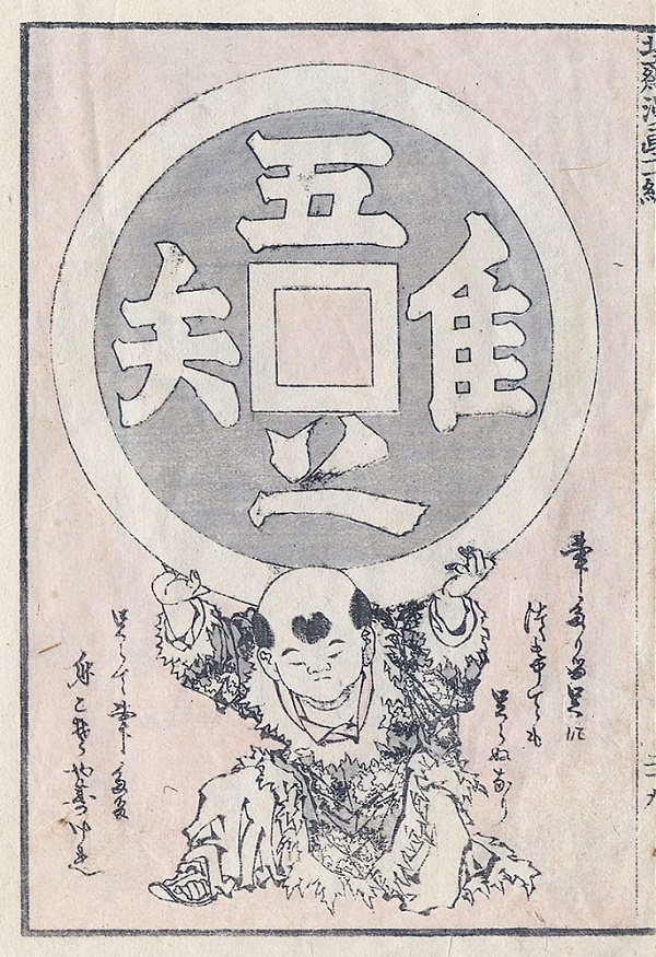 葛飾北斎の北斎漫画の図案 唐子が担いだ”つくばい"の文字は「吾唯足るを知る」
