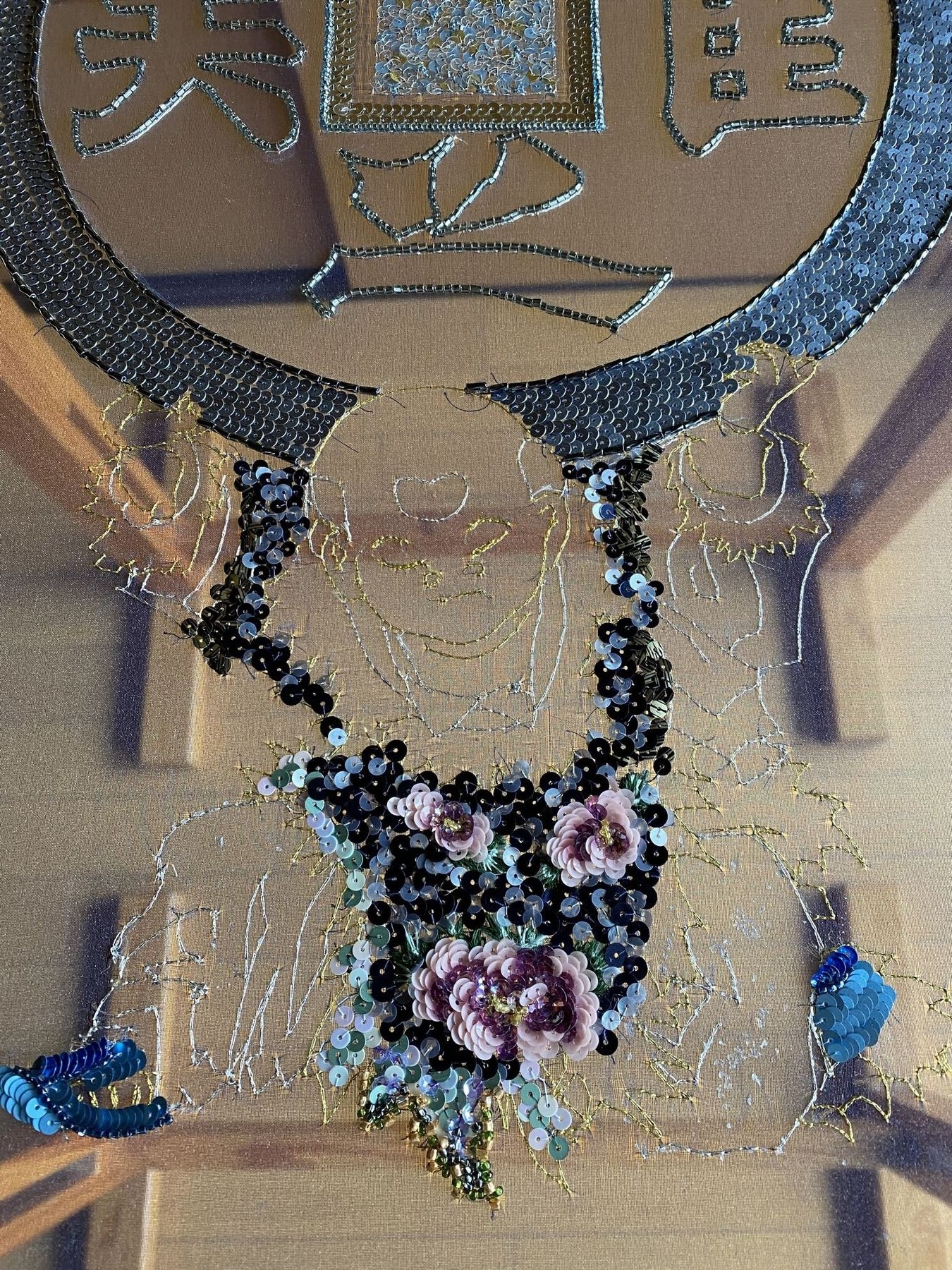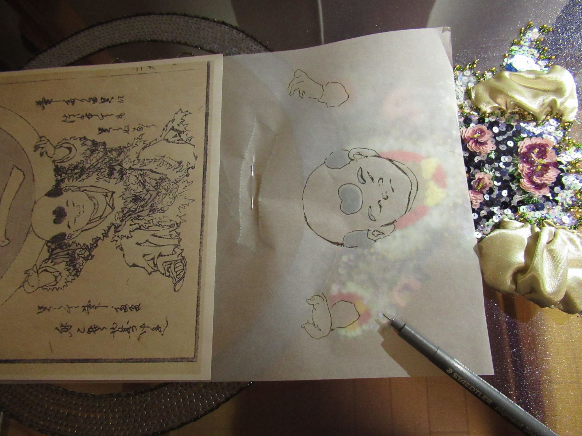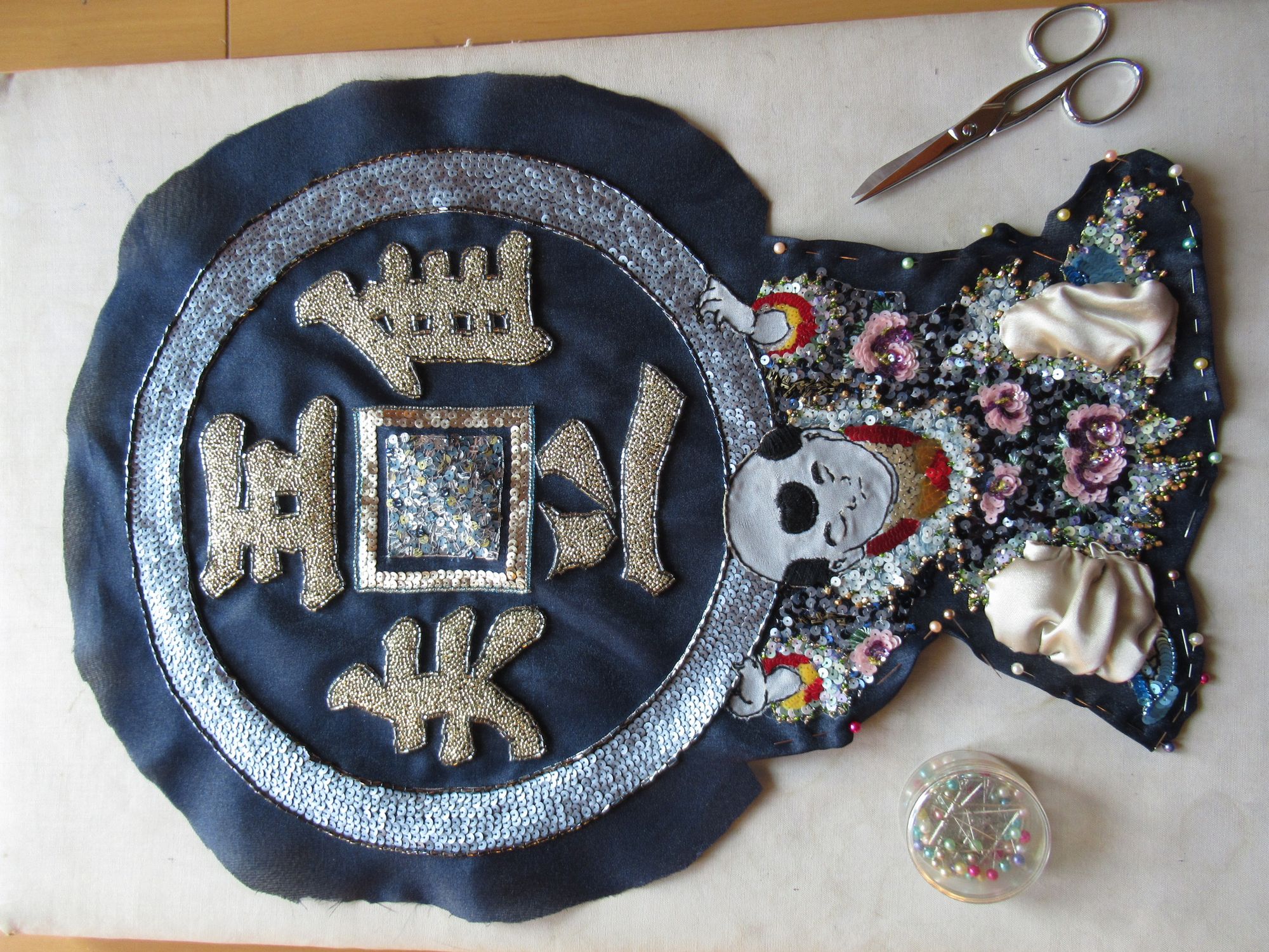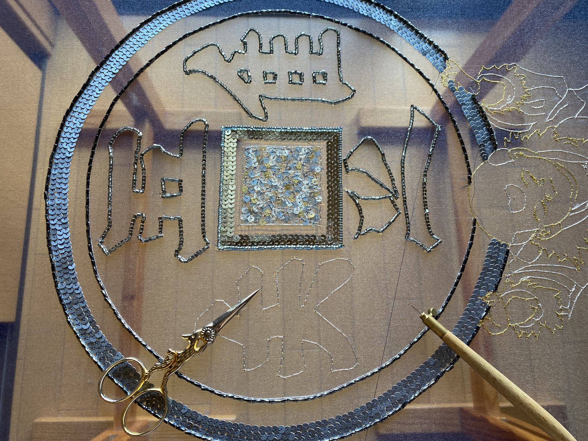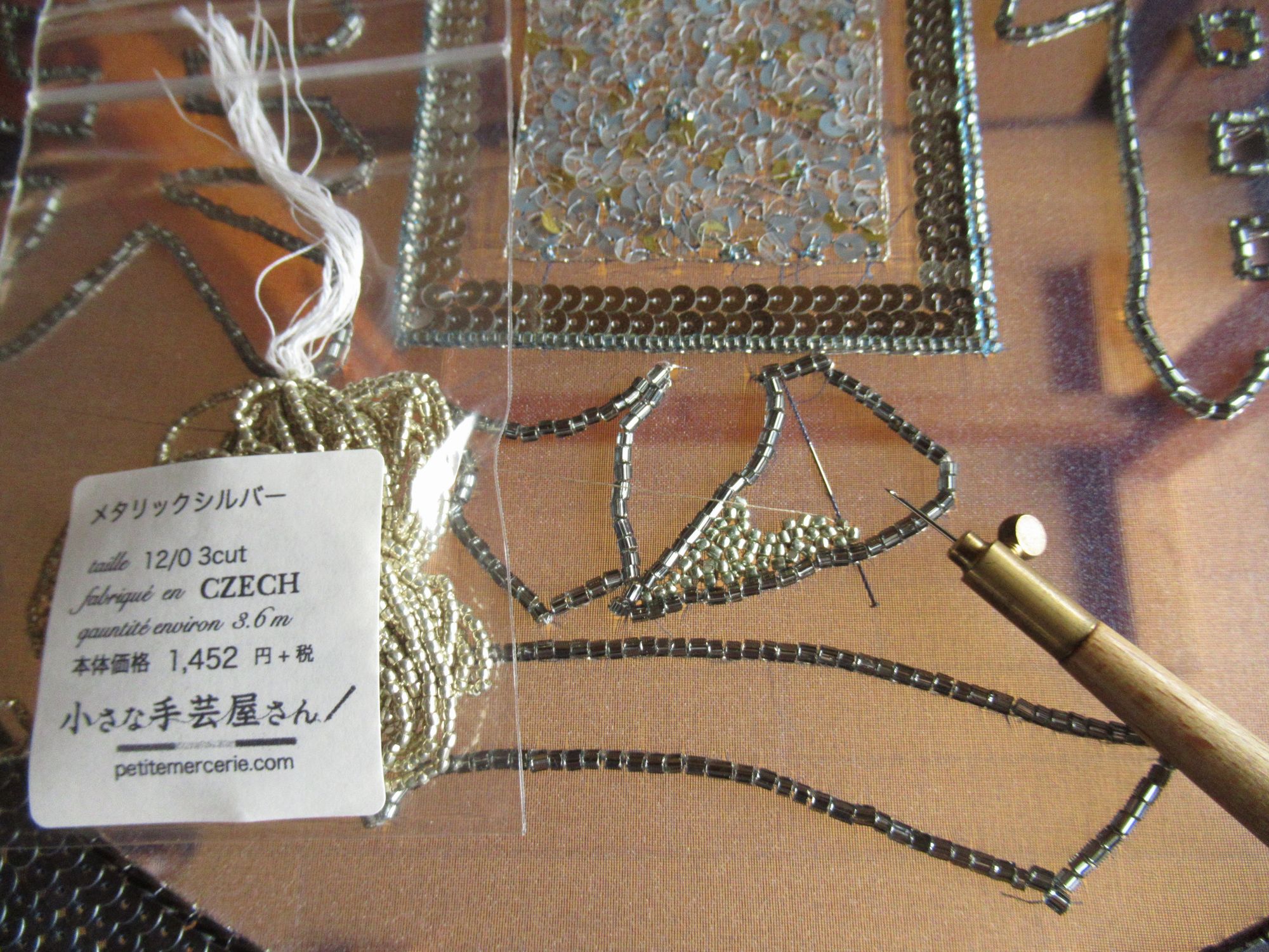 つくばいから刺繍していきます。中央の四角は三色のスパンコールをヴェルミセル(ランダムに刺す技法)