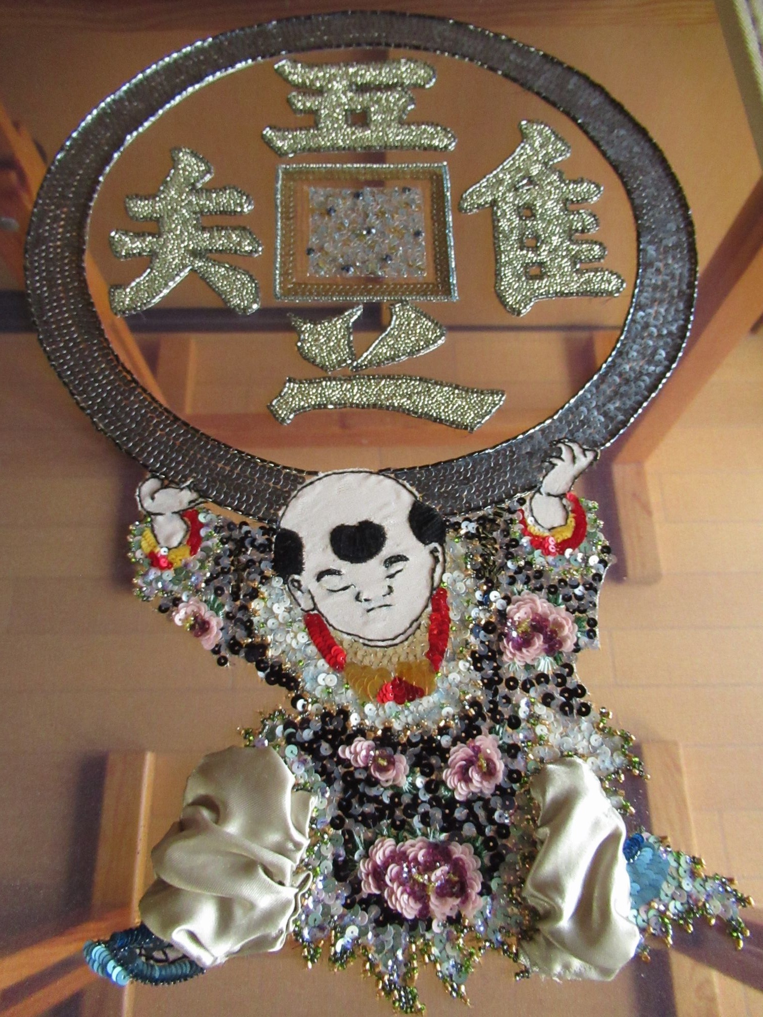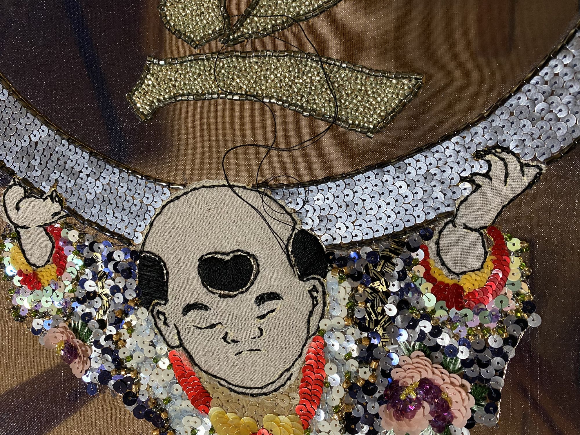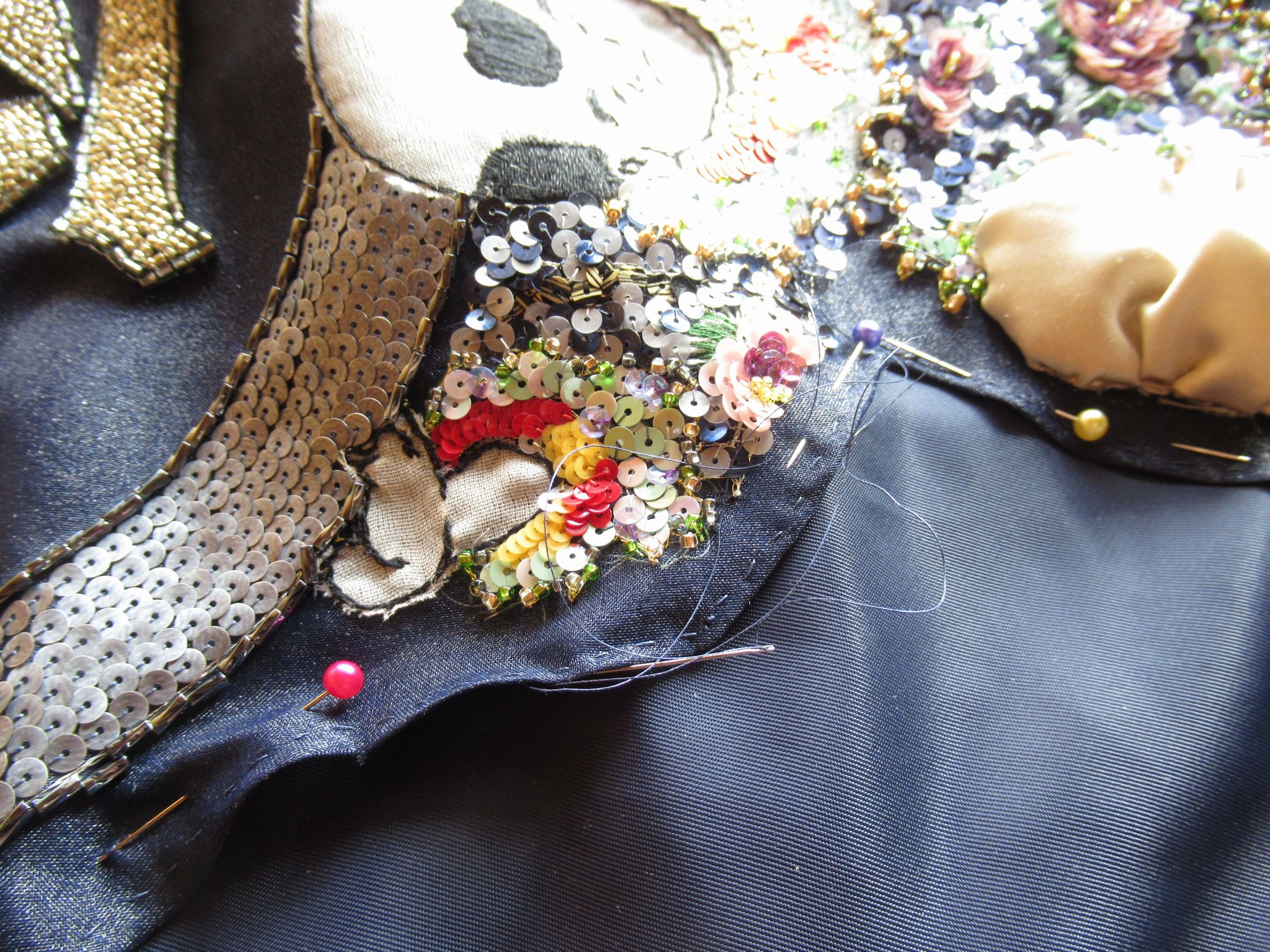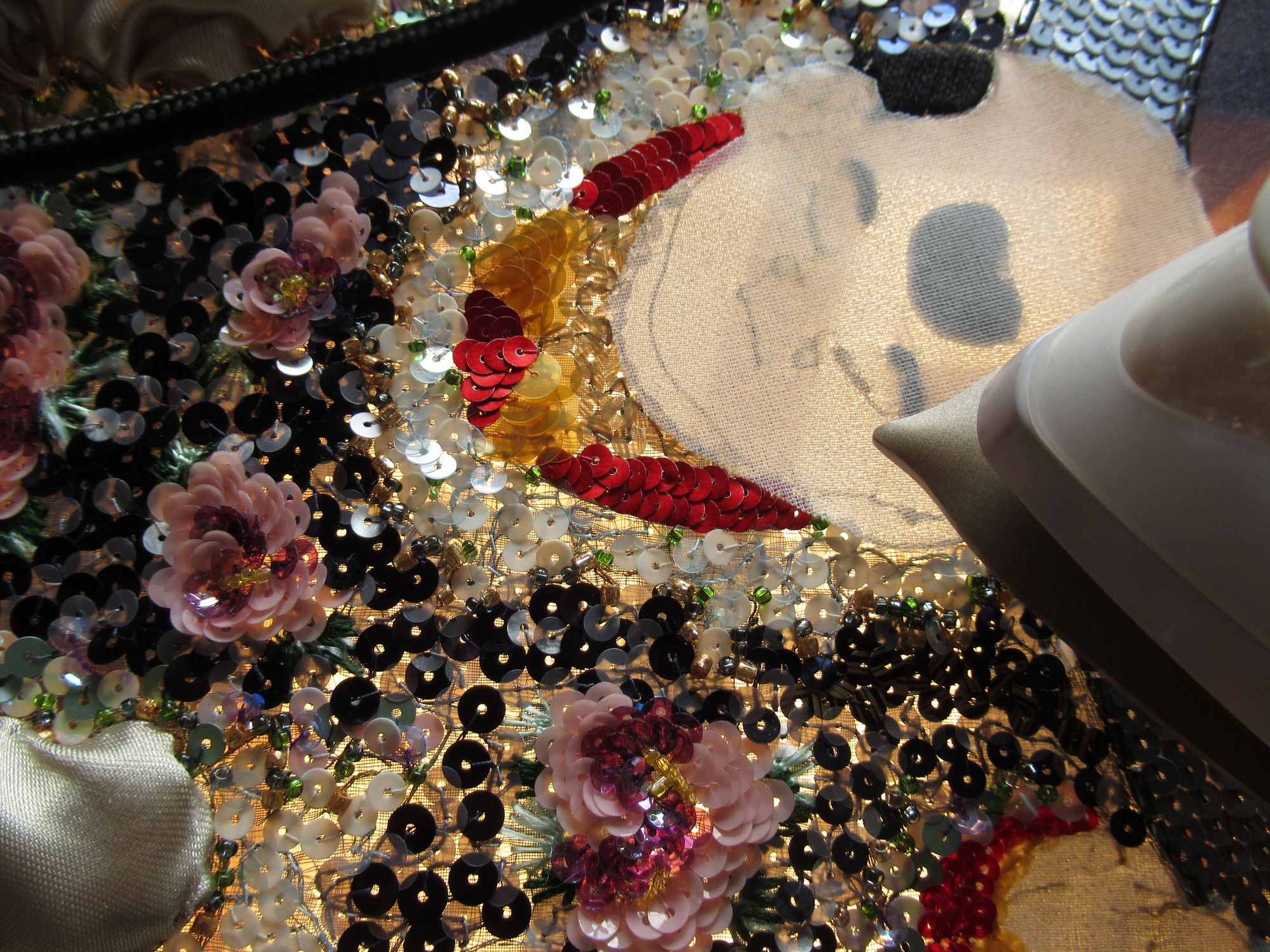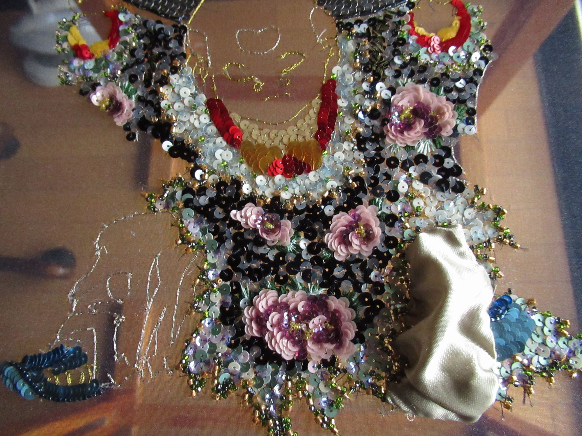 つくばいから刺繍していきます。中央の四角は三色のスパンコールをヴェルミセル(ランダムに刺す技法)
