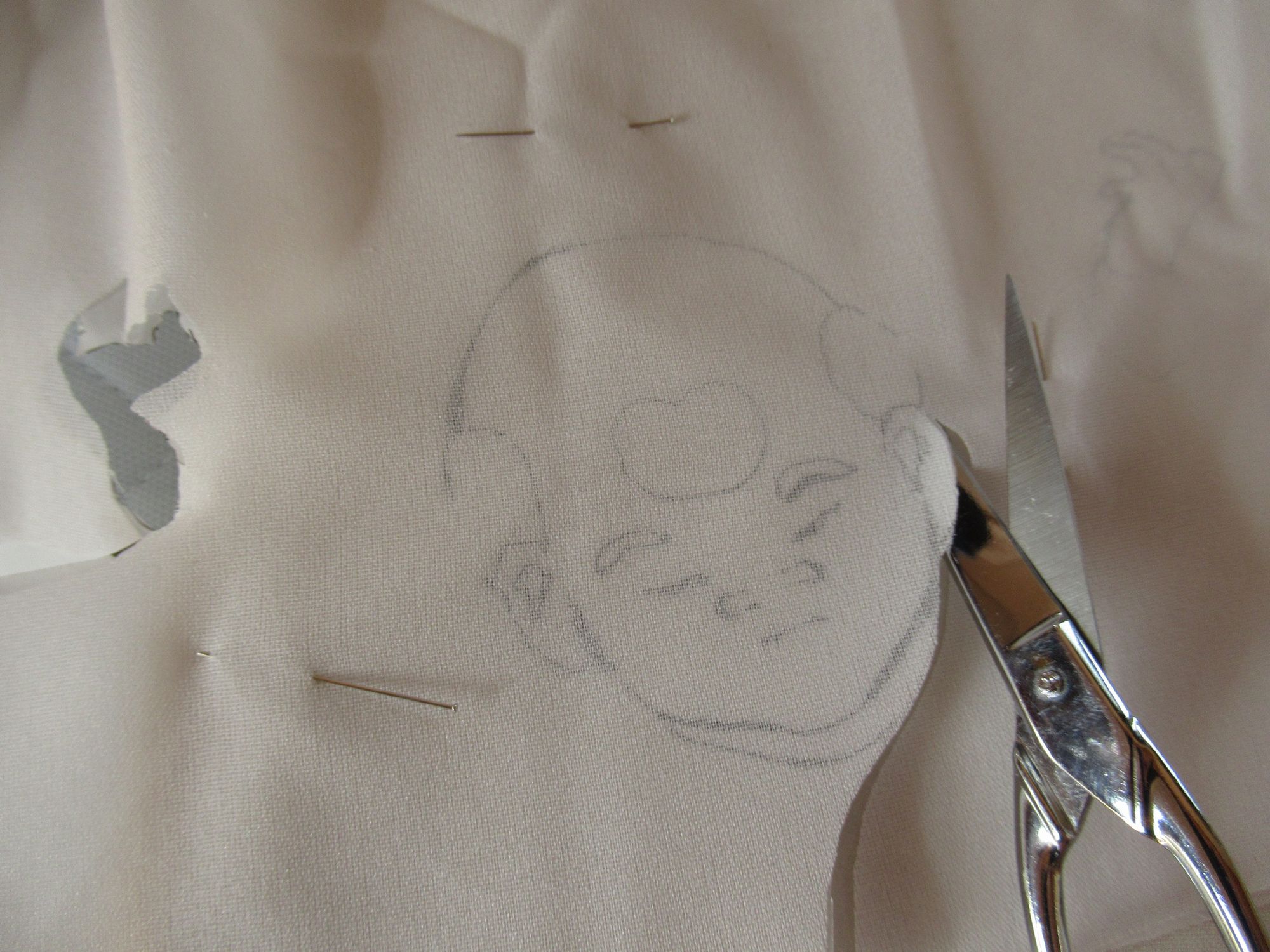 布地に色鉛筆で写して糸で輪郭を刺繍します。(裏に当布をして撮影)