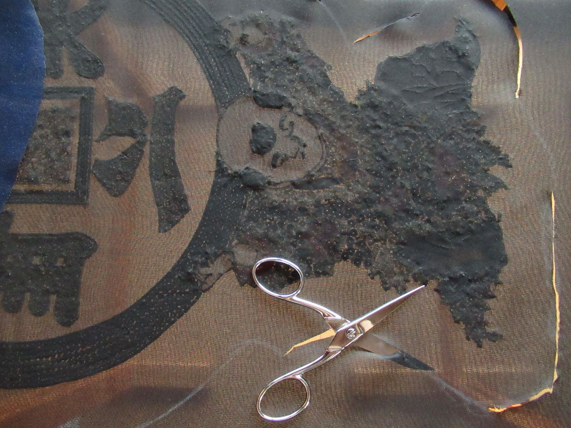 服に付けるため裏全体に黒布の接着芯をアイロンで付け切り取ります。