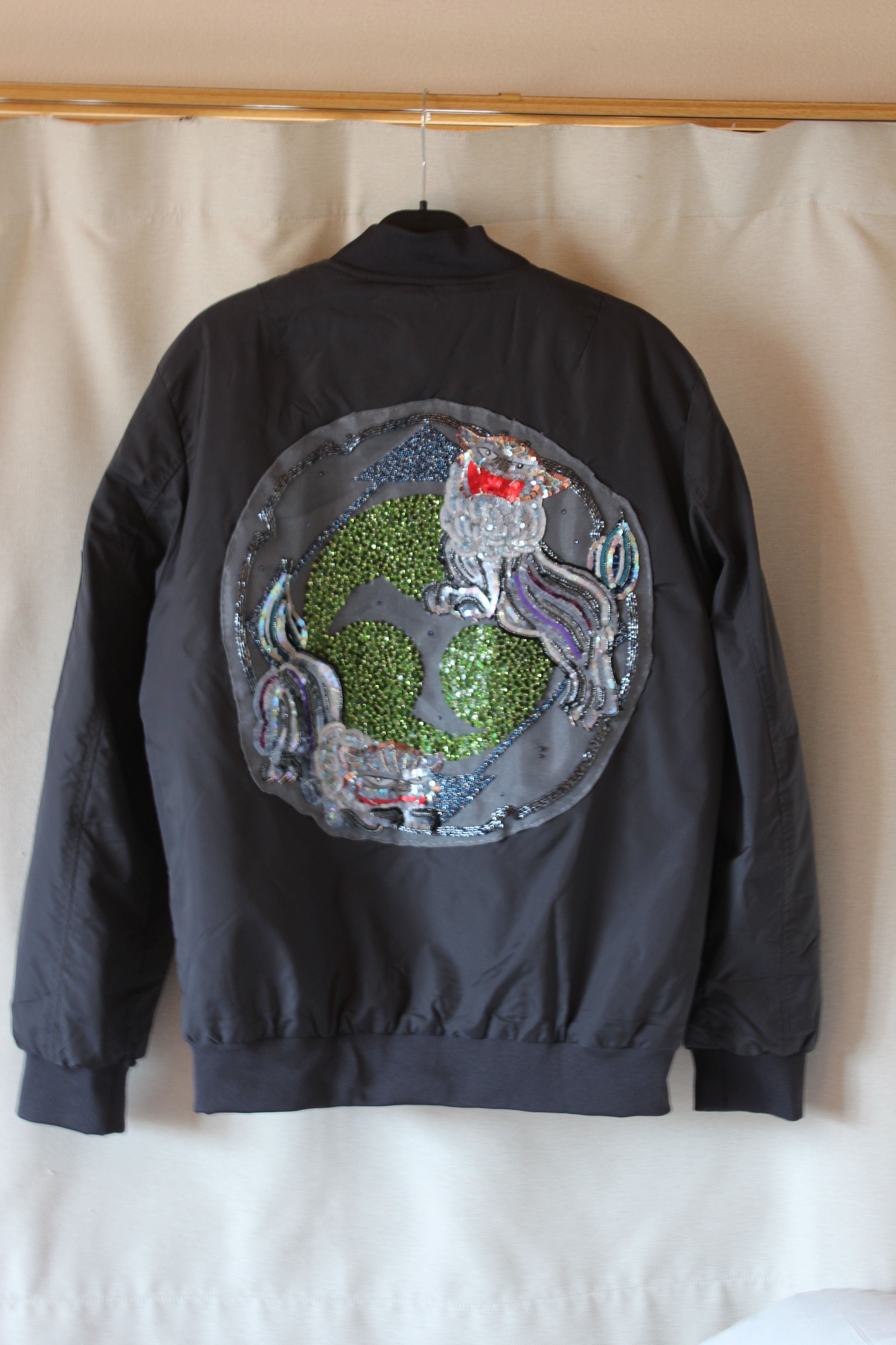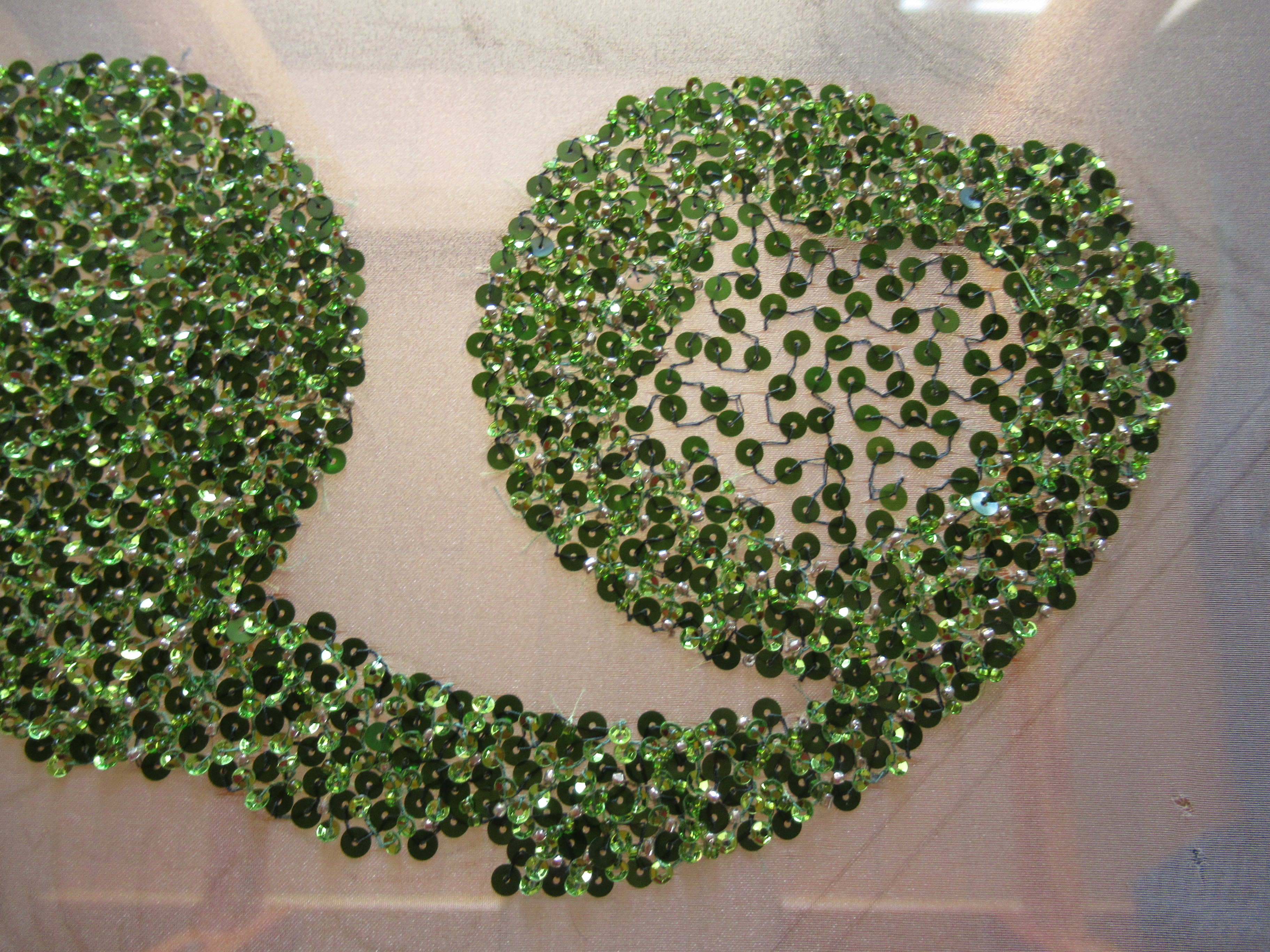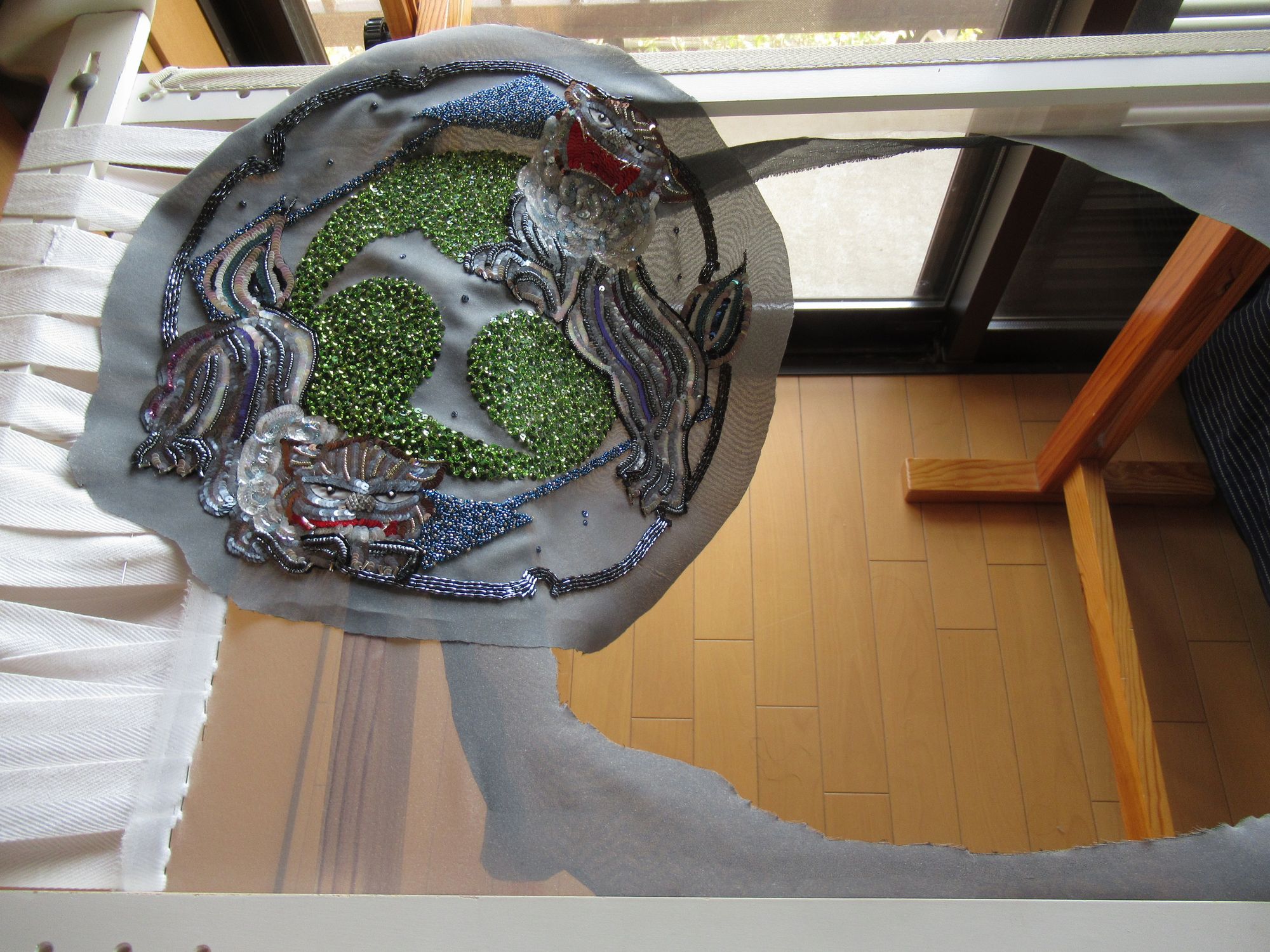 背景の家紋から刺繍していきます。4色のスパンコールをヴェルミセル(ランダムに刺す技法)で華やかさを表現。