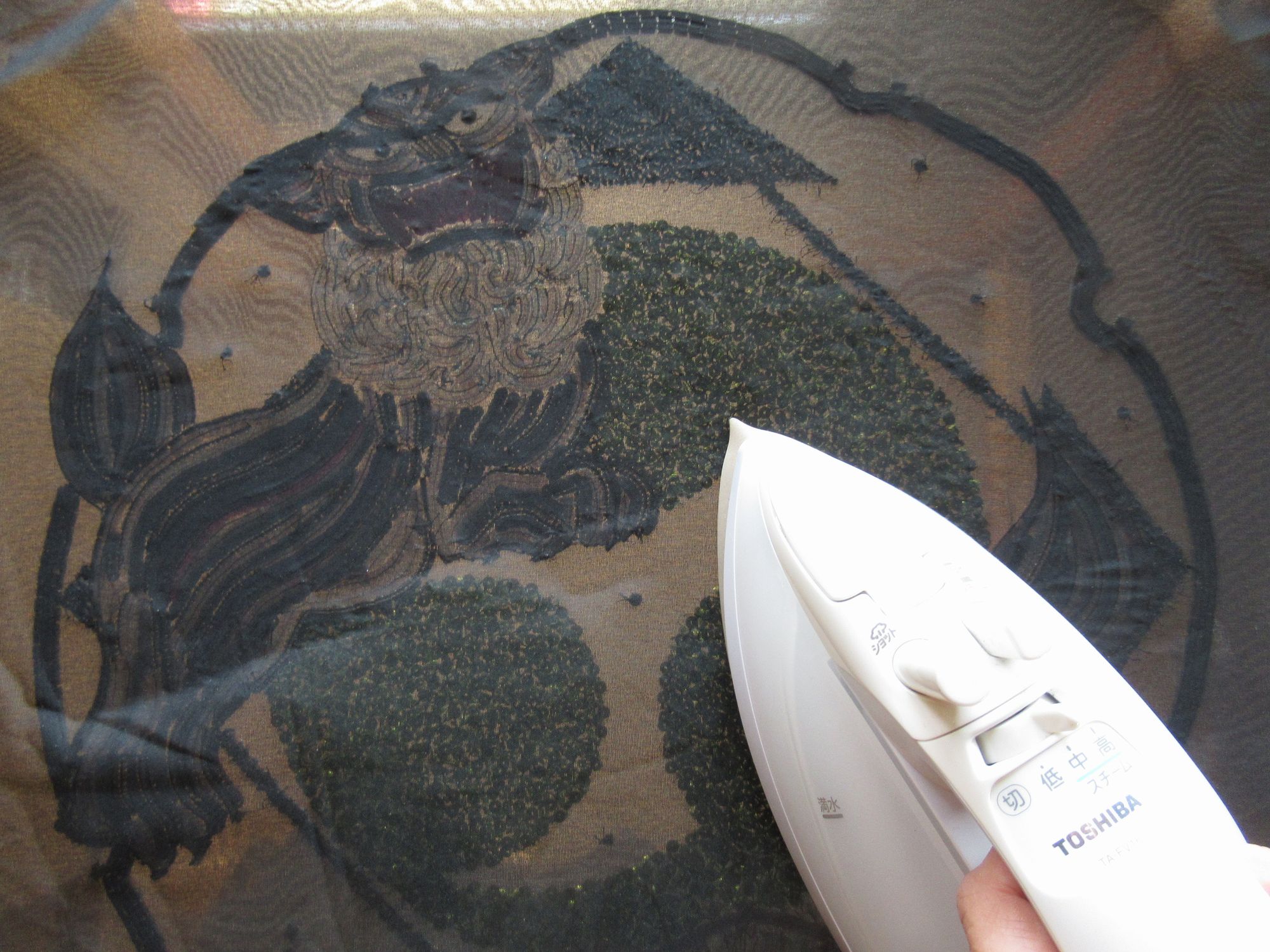 服に付けるため裏全体に黒い接着芯をアイロンで付け切り取ります。